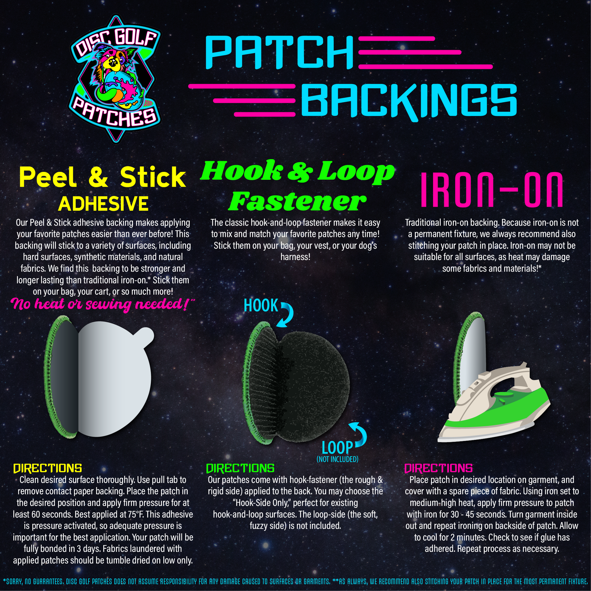 Choose from iron-on, velcro, or peel & stick adhesive. With three different backing options, you can add Disc Golf Patches to your bag, your cart, or your clothes!